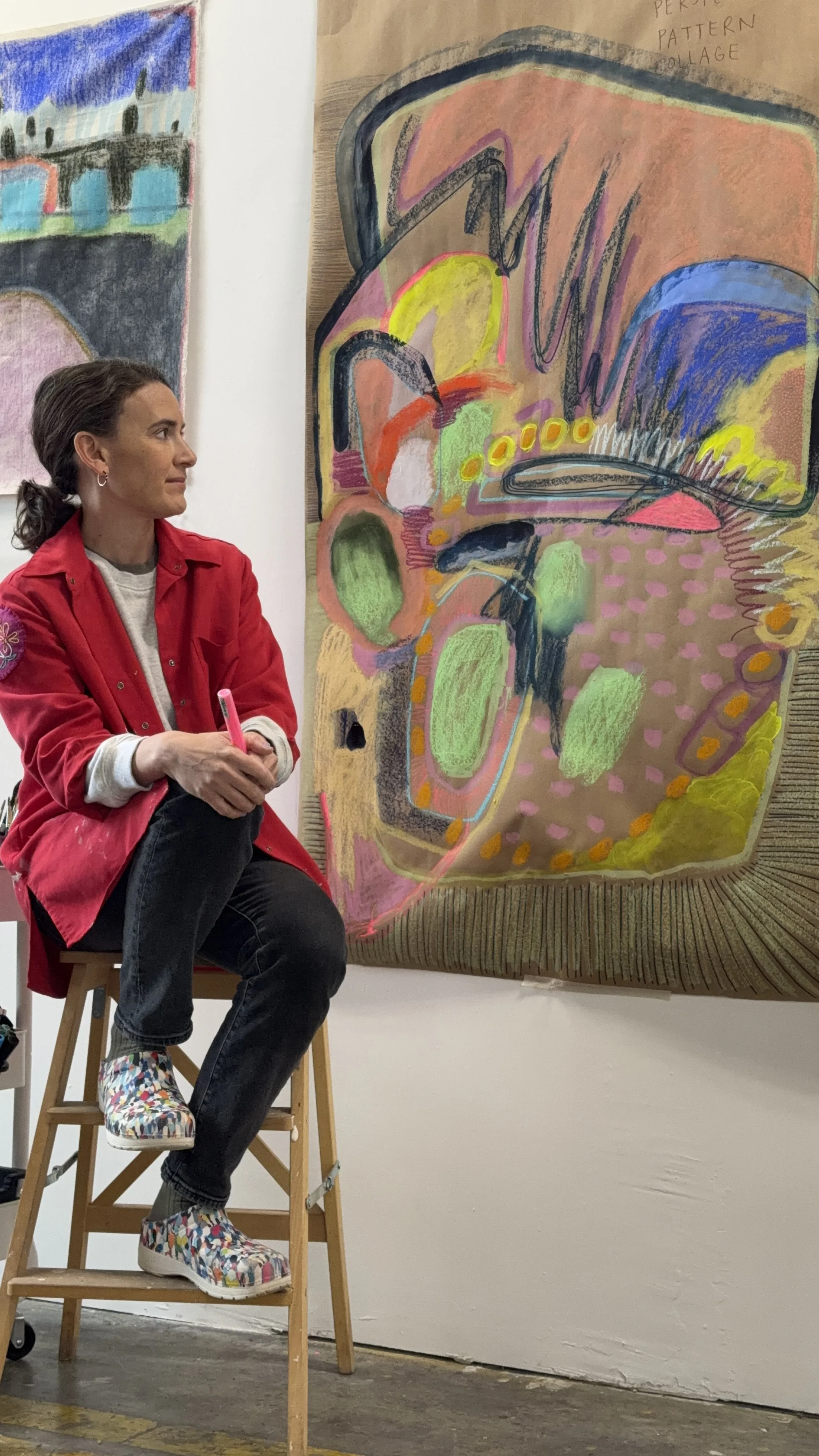 Somewhat autobiographical, I hint at escapism through my use of color, texture, and layers of material. Creating portals of fantastical landscapes and references to natural patterns, I work both intuitively and extremely deliberately as I weave in and out of memory, distraction, and life’s interruptions. Material exploration is central to my process, where seasonal rhythms shape my use of traditional mediums like acrylic and watercolor paint alongside foraged objects, paper clay, embroidery, and repurposed fibers. Motherhood has reignited my sense of play, influencing themes of maternal lineage, memory, and place in my work. Daily art challenges have helped me embrace quick decisions and playful exploration. Collage became a key technique, allowing me to create within the time constraints of family life. In this season of active parenting, the complexities of my mental load often echo in the layers of my work, reflecting my inner dialogue and the delicate balance of caring for others while navigating personal needs.